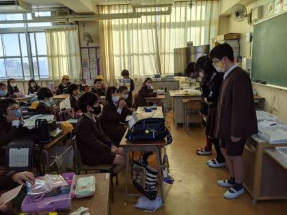 朝の時間、5年生の児童が各クラスにお知らせにやってきました。