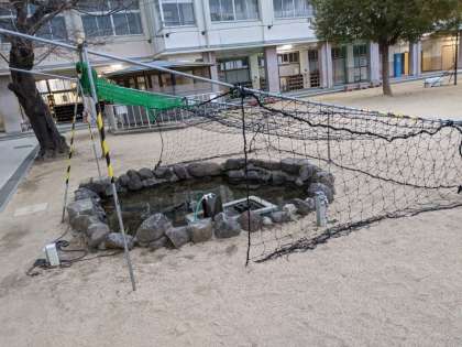 その中で、運動場にあるメダカ池によくボールがはいってしまって困ることがあるという問題を5年生のアイデアでネットをはることにしたそうです。