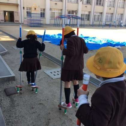 さっそく新しい竹馬を見つけた子どもたちが遊んでいました。