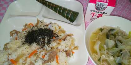 今日の給食は、子どもの日の行事献立で「きんぴらちらし、すまし汁、ちまき、牛乳」でした。