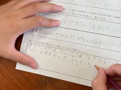 言葉の使い方や表情を見ながら思いを伝えることの大切さに気づき、今後の生活で思いやりのある言葉を使っていきたいという意見がたくさん聞かれました。さすが5年生!