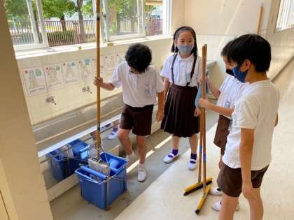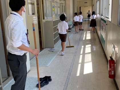 保健室前から職員室前まで、毎日丁寧に掃除をしている4年生。今日はモップの使い方を習って、早速チャレンジしてみました。