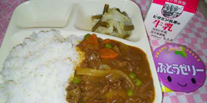今日の献立は、「ビーフカレーライス(米粉)、野菜のピクルス、ぶどうゼリー、牛乳」です。