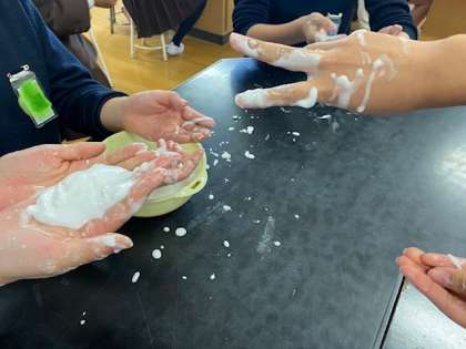 科学クラブでは、ダイラタンシー(ダイラタント流動体)を作って実験をしました。材料は、片栗粉と水だけです。