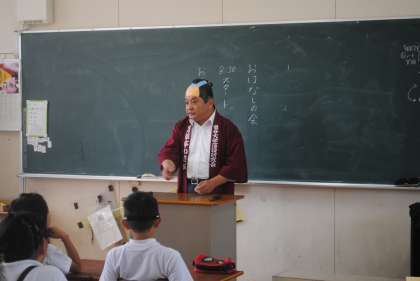また、6月からは4年生以上を対象に各クラスで「深草亭わさび」こと重高教頭先生によるお話会(落語)を行っています。本日は4年2組で行い、演目は「さらやしき」です。子どもたちは興味深く聞き入っている様子でした。来週も4年2組で行う予定で、子ども達は次はどんなお話かと期待しています。