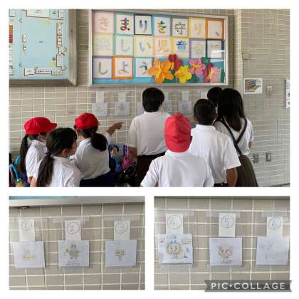 児童会活動で全校児童に呼びかけて募集したイメージキャラクターが、ピロティに掲示されています。