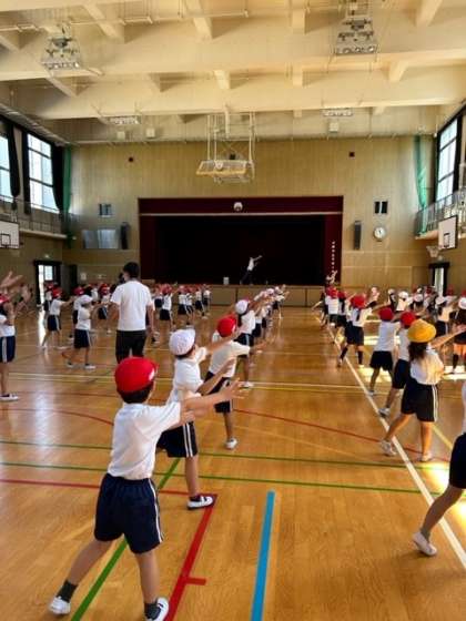 前に立つ先生をよく見ながら、曲に合わせて一生懸命練習しています。