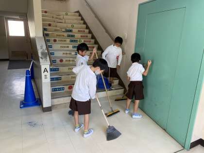 2年生の子ども達が、階段のすみや溝に溜まったごみまで丁寧にほうきで集めていました。友だちと協力して、たくさんのごみが一ヶ所に集まると、みんな得意げな様子で掃除の仕方について説明してくれます。