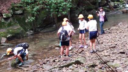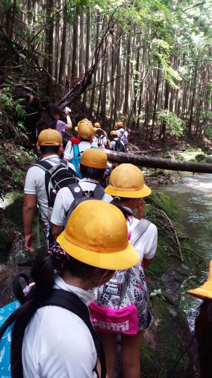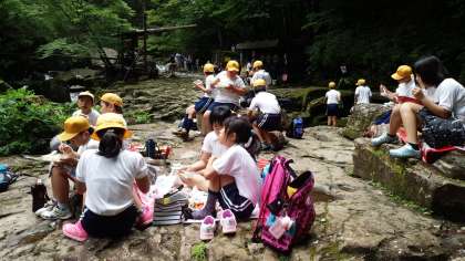 滝を見ながらのオリエンテーリングをしました。途中、台風による倒木もありましたが、百畳敷でお弁当を食べ、水遊びも楽しみました。雨にあうこともなく、無事頂上までゴールすることができました。
