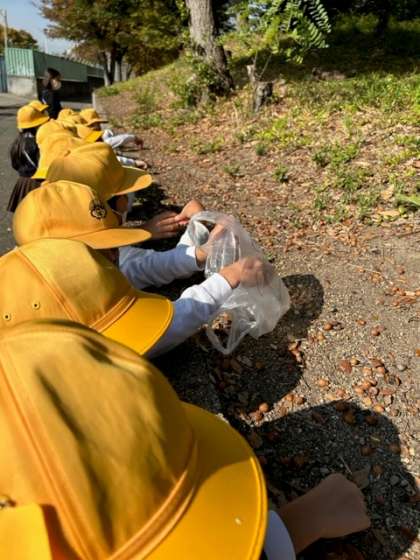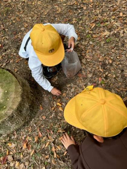 帽子のかぶったどんぐりを見つけて、子どもたちは「おしゃれどんぐり見つけた‼」大興奮の様子でした。