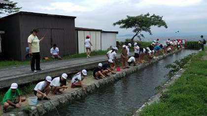 ザリガニつりをしました。真剣な表情で取り組んでいます。みんな釣れたかな?