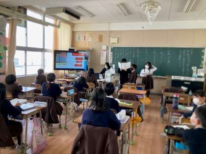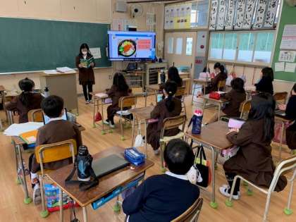 国旗が表す意味や国の位置、食べ物や言葉など、その国の文化について、タブレットを用いてスライドを作成し、分かりやすく発表することができました。