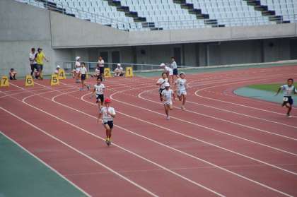 大きな陸上のトラックがあるヤンマースタジアム長居で、子どもたちは力いっぱいに100メートルを駆けぬけました。各学年上位8名による決勝にも出場し、5年生女子が7位・8位入賞、4年生男子が2位、4年生女子が2位・6位というすばらしい結果を残してくれました。また、4×100メートルリレーでは、見事に4年生男子が3位、女子が1位をとりました。
