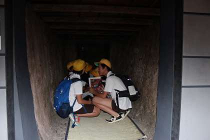 ピース大阪では、戦時中の大阪の様子を班で見学しながら、ワークシートに記入していきます。防空壕体験ゾーンでは、実際に防空壕の中に入ると、逃げ惑う人々の声や爆撃音が聞こえてきて、当時の人々の恐怖を知ることができました。