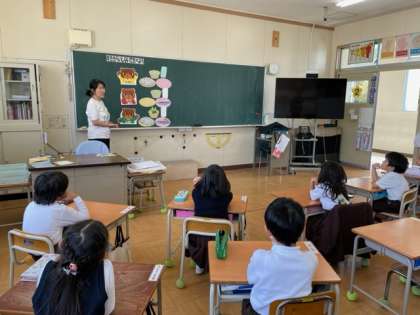 給食の先生が、身体の調子をととのえる食べ物・身体をつくる食べ物・エネルギーのもとになる食べ物についてお話してくれました。好き嫌いなく食べることの大切さを考えることができました!