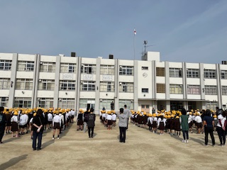 全校生徒そろっての初の児童朝会。みんなで並ぶ場所を確認して校長先生のお話「日差しも強くなってきたので、帽子をかぶろう」と「友だちの良いところを見つけよう」というお話をみんなしっかり聞くことができました。