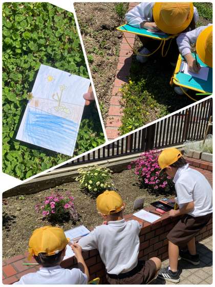 2年生は、学習園や花壇のまわりで春の草花や生き物探しに取り組んでいました。