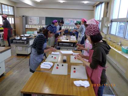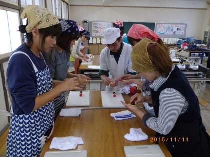11月11日(水)に、15名のPTA会員が参加しPTAクッキング教室を行いました。昨年に続き、サンクス平尾商店街にある和菓子店「五色屋」さんを講師に招き、和菓子作りを体験しました。みなさん初めてとは思えない手つきで、きれいな和菓子を完成させていました。