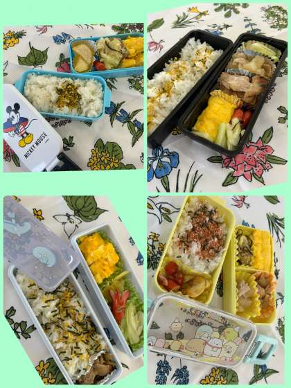 じゃがいものバターソテー、野菜の炒め物、だし巻き卵、ウインナーの飾り切りを作り、彩りや位置を考えながらお弁当箱に詰めていました。