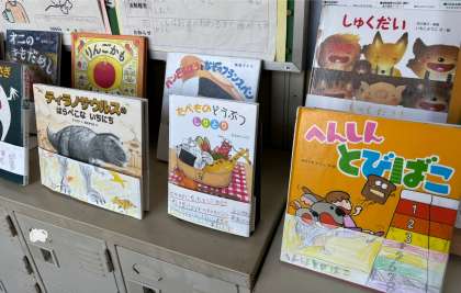 図書室、職員室前に4年生が取り組んだ本の帯の作品がずらりと並んでいます。