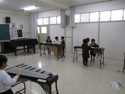 入学以来、はじめて音楽室に行きました。12月に手話と歌、鍵盤ハーモニカで取り組んだ「きらきらぼし」で、簡単な合奏をしました。使った楽器は、木琴・鉄琴・タンバリン・カスタネット・小太鼓・大太鼓・トライアングル・ギロ・シンバル・メロディチャイムなどでした。(写真は、一回目の木琴と鉄琴を触った時のものです。)