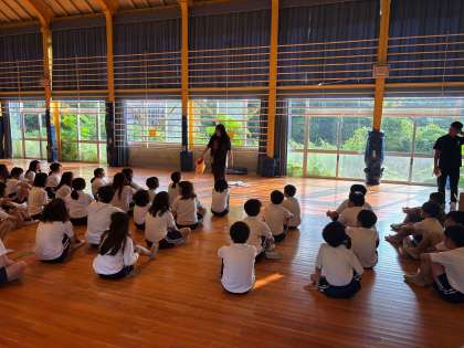 体育館で、朝の集い。健康観察の後、先生のお話を聞いて、今日の活動の見通しをもちました。みんな元気です。