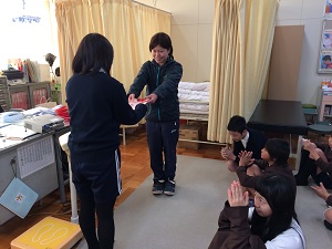 6年生にとって、最後の体重測定の時間。保健室から6年間の成長の記録をプレゼントしました。こんなに小さかったん!?と驚いている子、うれしそうに自分の成長を感じている子、伸びた身長の長さのリボンを顔に当てる子・・・とさまざまでした。一番身長が伸びていた子は、なんと6年間で46.7cmも伸びていました。