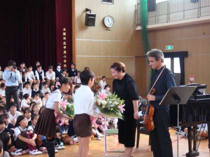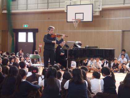 10月31日(木)講堂にて音楽鑑賞会を行いました。ルーマニアのヴァイオリニスト、ダヌーツ・マーニャさんとピアニスト塚本眞規さんが来られました。「アヴェ・マリア」「愛のあいさつ」など全4曲が演奏され、深く、美しい音色が響きわたりました。保護者の方と共に、全校児童が音楽のすばらしさを味わいました。