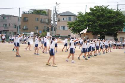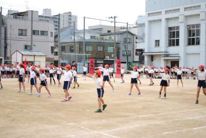 写真は応援合戦の様子です。毎日、放課後を中心に熱心に練習に取り組んでいます。応援歌によるダンスなど、全校児童で盛り上がることができる工夫しています。