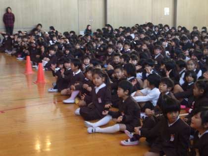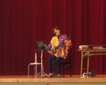 まず、三味線で日本民謡から「黒田節」「ソーラン節」などを、次に三線で「安里屋ユンタ」「花」などを演奏してくださいました。音色の違いや演奏の仕方の違いなどを知ることができ、最後に「ユイユイ」を合唱して楽しい雰囲気で幕を閉じました。