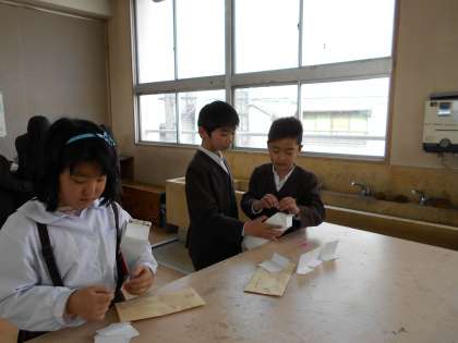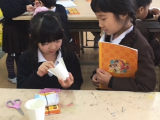 3月2日(木) 1年生に「おもちゃ教室」を開きました。2年生がおもちゃの説明をして1年生に作ってもらいました。作り方を伝えるのはなかなか難しかったですが、1年生が楽しんで遊んでくれてうれしかった2年生でした。