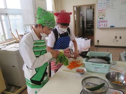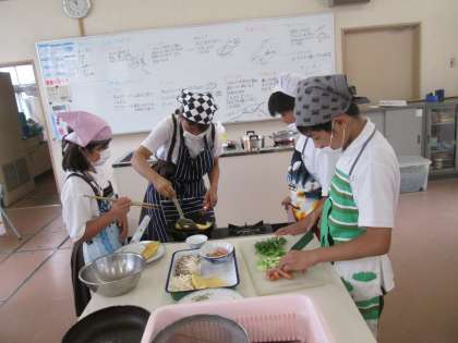 料理の経験がある子が班のリーダーシップをとって主体的な活動をすることができました。今回は「炒めてつくろう 朝食のおかず」ということで、野菜を中心とした炒め物と卵を使ってスクランブルエッグなどを各班でつくりました。