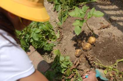 6年生は、これまで、植物の蒸散の学習をするためにジャガイモを育ててきました。「植物のつくりとはたらき」の学習が終わったので、ジャガイモを掘り起すと、意外にもたくさんのジャガイモができていました。