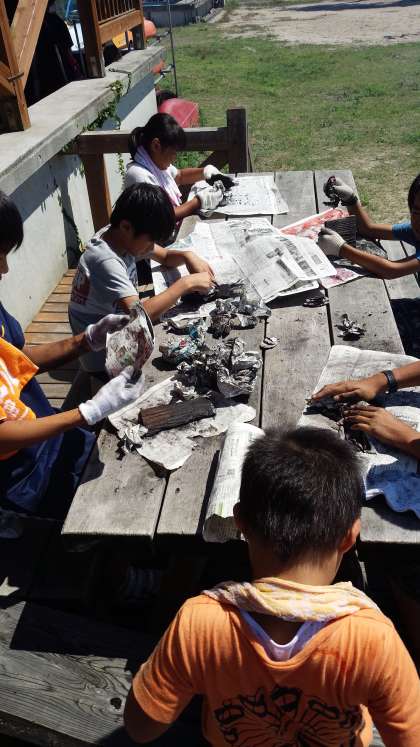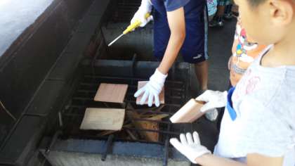 真っ黒に焼いた板をこすり、炭を落としていく作業は、なかなかの重労働です。
