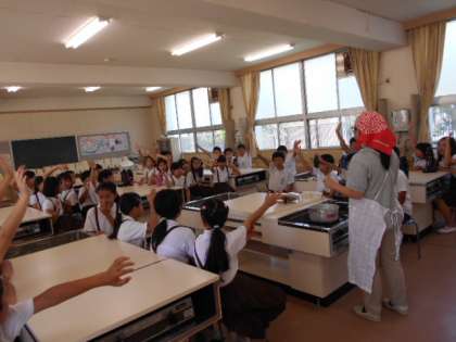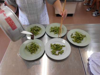 最近は、暑い日が続いています。昨日、学習園で栽培していた枝豆をみんなで収穫しました。その日のうちに家庭科室で調理し、塩ゆでにしていただきました。みんな、収穫をめずらしそうにしていましたが、お味のほうはなかなかの好評でした。
