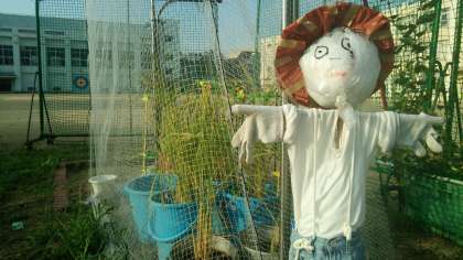 5年生が1学期から大切に育てているバケツ稲のそばには、「かかし」が登場しました。子どもたちが話し合いを重ねて、自分たちで作りました。