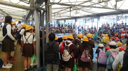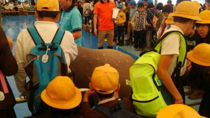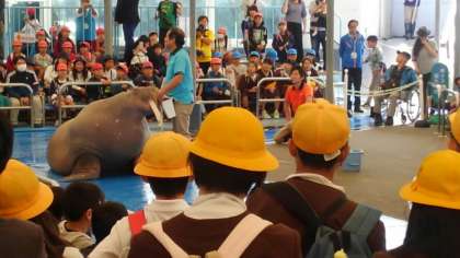 セイウチふれあい体験です。セイウチのポーちゃんのパフォーマンスを見た後、セイウチをさわりました。