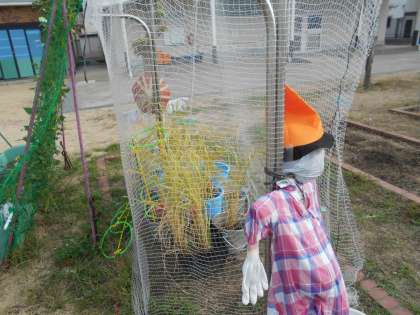 秋晴れの下、学習園で大切に育ててきたお米の稲刈りを実施しました。はさみを使って、根元のほうから1つ1つ丁寧に刈り取っていきました。慣れない作業でとまっどている子もいましたが、無事に作業を終えることができました。キレイにならべて干して来週あたりには脱穀作業の予定です。