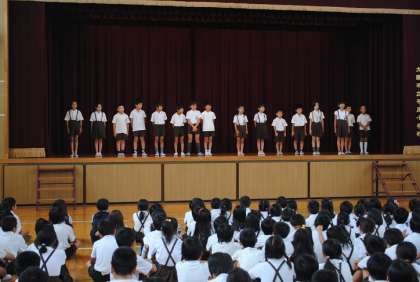 3・4年生の代表児童によるスピーチからは、学習や友だちとのことなど、それぞれのがんばりや決意が伝わってきました。校歌斉唱では6年生を中心に美しい歌声が響きました。
