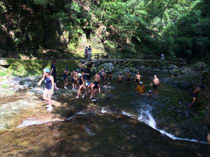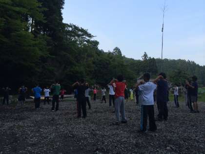 2日目は天気も良く、朝は近くの神社での朝のつどいからスタートです。みんな元気に過ごしています。川遊びは冷たい水が気持ち良く、おおはしゃぎです。今年は川で「オオサンショウウオ」を発見できるでしょうか?