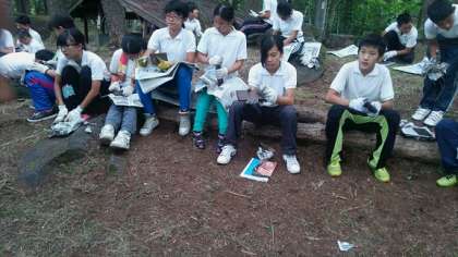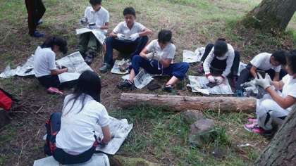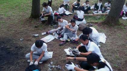 飯ごう炊はんのかまどで焼いた、焼き板をみがいています。