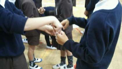 ペアになって、友だちの手のわっかに自分の人差し指をいれます。キャ・キャ・キャ・・・「キャッチ」と聞こえたら友だちの人差し指をつかみます。右手と左手でつかまえるのと逃げるのとを両方しないといけないので大変です。