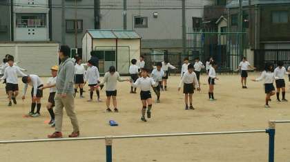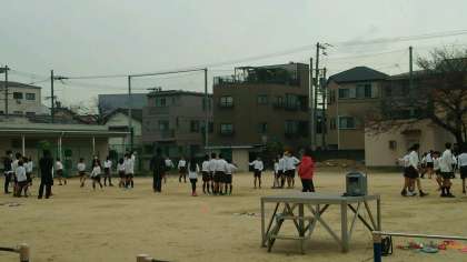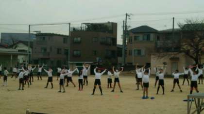 短縄でウォーミングアップをしたあとは、長縄です。チームの記録を一回でも多くできるように、声をかけあいながら練習しました。