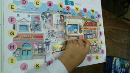 3年1組の教室では、絵の中にかくれているアルファベットを探す活動をしていました。
