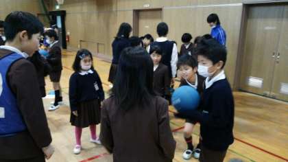 たてわり班で円になり、真ん中に一人入ります。真ん中に入った人が「ゴロゴロゴロゴロ…ストップ!」と言います。ストップと言われた時にボールをもっていた人が、交代して真ん中に入ります。慣れてくるにしたがって、色々なグループから歓声が聞こえてきました。