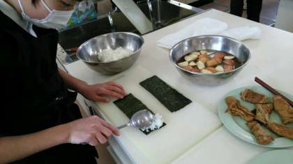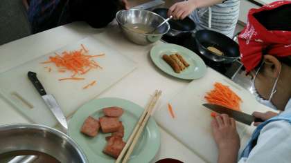 にんじんシリシリ、ポークおにぎり、ちんびんを作っていました。友だちと協力して楽しく調理していました。