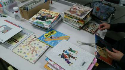 火曜日は、図書館補助員さんが来てくださる日です。今日は、図書ボランティアの方も来てくださいました。図書館の掲示物を作ってくださったり、本の修繕を行ったりもしてくださっています。