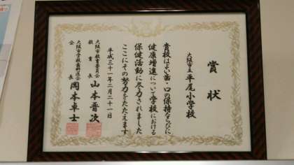 平尾小学校がいただいた表彰状は、保健室にかざってあります。