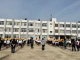 全校生徒そろっての初の児童朝会。みんなで並ぶ場所を確認して校長先生のお話「日差...