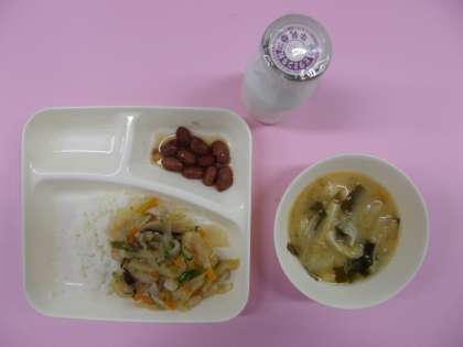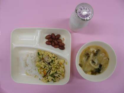 本日から2学期の給食が始まりました。献立名は、「親子丼、みそ汁、金時豆の煮もの」でした。また、今日はアレルギー対応の卵除去の個別対応献立でした。
